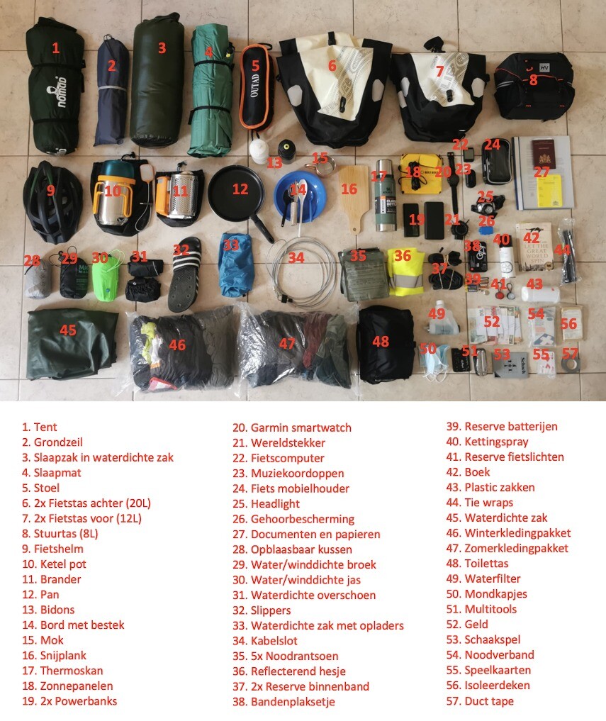 Daarbij moest Joost ook nog eens rekening houden met zomer én winter. Maar het is 'm aardig gelukt! Als het goed is. Dit heeft ie momenteel allemaal mee voor- en achterop z'n fiets: