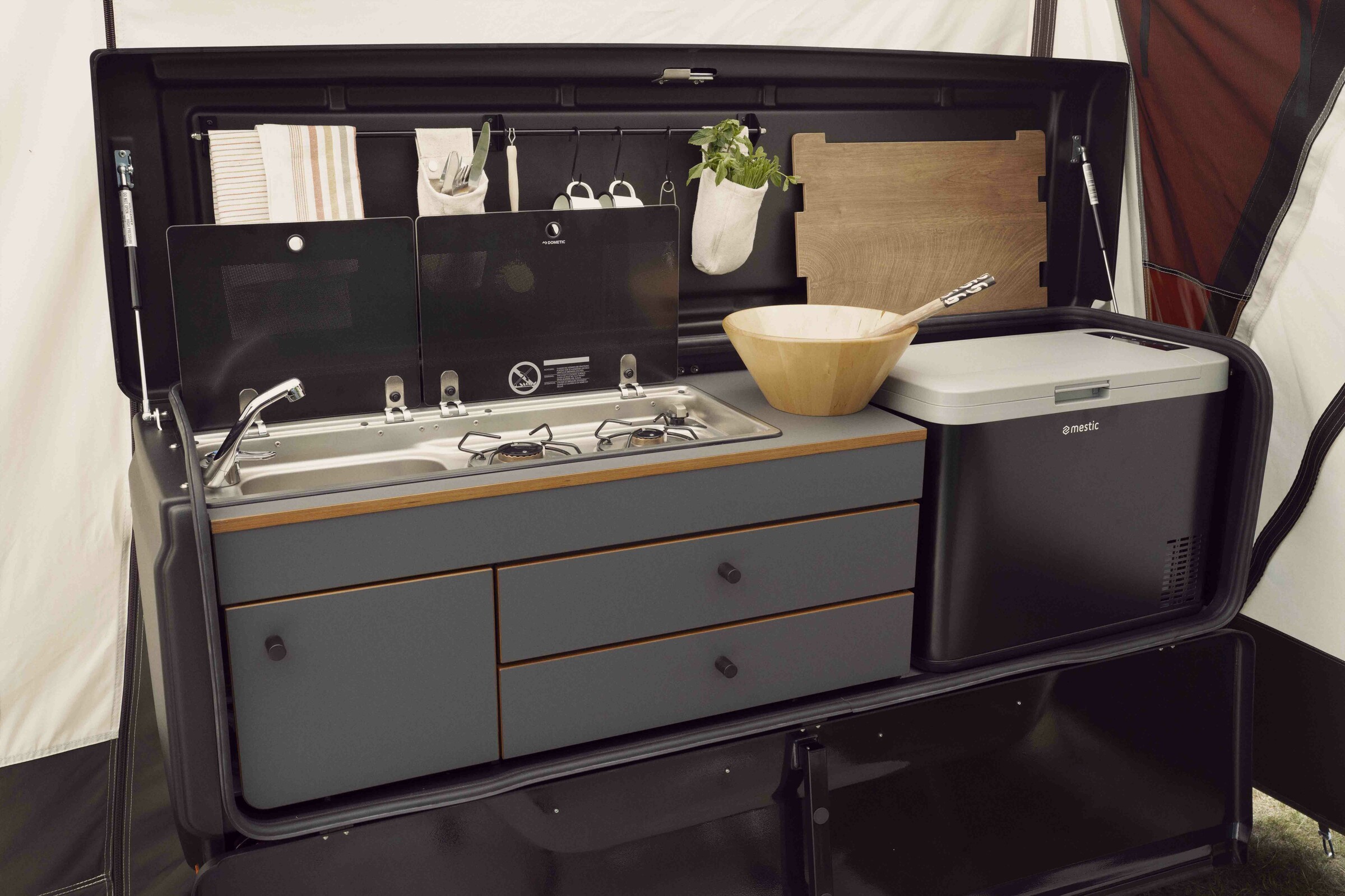 Kookgemak: De keuken biedt alles wat je nodig hebt: veel opbergruimte, een strak design, 2 of 3-pits kookplaat, stromend water en een krachtige Dometic compressor koelkast. Slim koken, waar je ook bent.